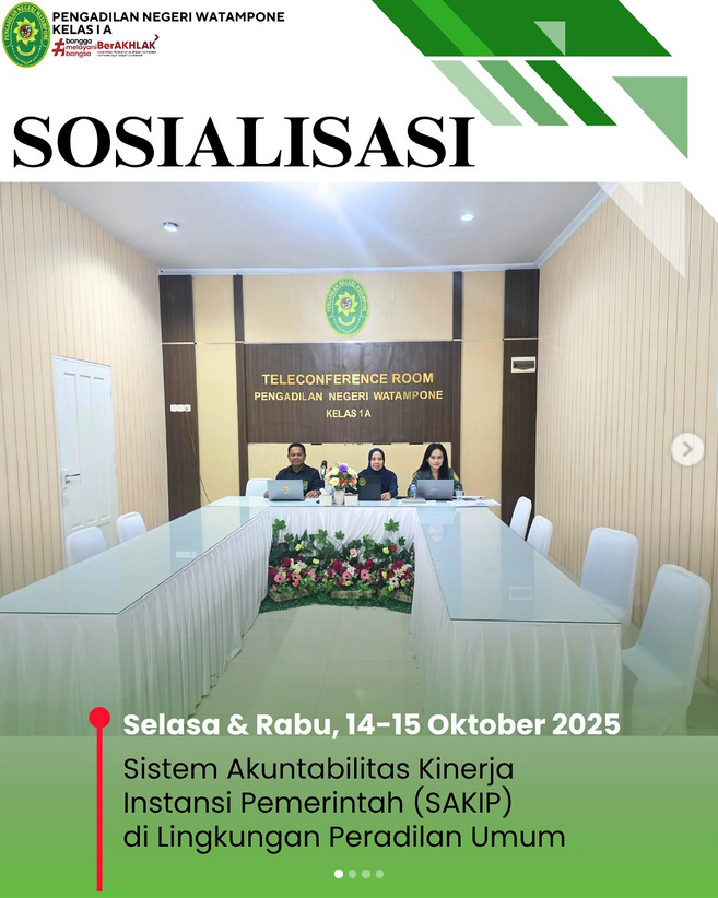 Kegiatan sosialisasi dan implementasi Sistem Akuntabilitas Kinerja Instansi Pemerintah (SAKIP) di lingkungan Peradilan Umum diselenggarakan secara daring pada tanggal 15–16 Oktober 2025. Acara ini dibuka oleh Direktur Jenderal Badan Peradilan Umum, Bapak H. Bambang Myanto, S.H., M.H., yang juga memberikan arahan secara langsung dari Pengadilan Tinggi Makassar. Sejumlah narasumber dari Badan Pengawasan (BAWAS) serta Biro Perencanaan dan Organisasi turut hadir untuk memberikan materi. Dalam kegiatan tersebut dibahas penyelenggaraan SAKIP serta disampaikan ikhtisar hasil evaluasi Akuntabilitas Kinerja Instansi Pemerintah (AKIP) untuk unit kerja eselon I dan pengadilan tingkat banding tahun 2024. Melalui kegiatan ini, diharapkan terwujud peningkatan kompetensi serta penguatan kolaborasi antara para pimpinan dan tim penyusun Laporan Kinerja Instansi Pemerintah (LKjIP), guna mendorong peningkatan kinerja dan membangun budaya kerja yang berorientasi pada hasil.