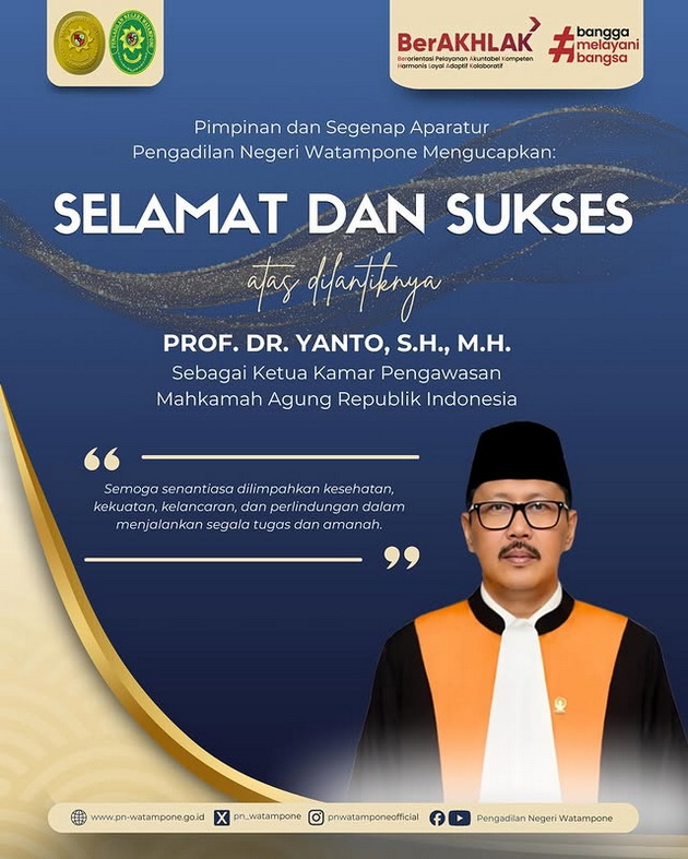 Pimpinan dan Segenap Aparatur Pengadilan Negeri Watampone Mengucapkan:SELAMAT DAN SUKSESAtas Pengambilan Sumpah Jabatan dan PelantikanYM. Dr. Hj. Nirwana, S.H., M.Hum. sebagai Ketua Pengadilan Tinggi Makassar Ucapan