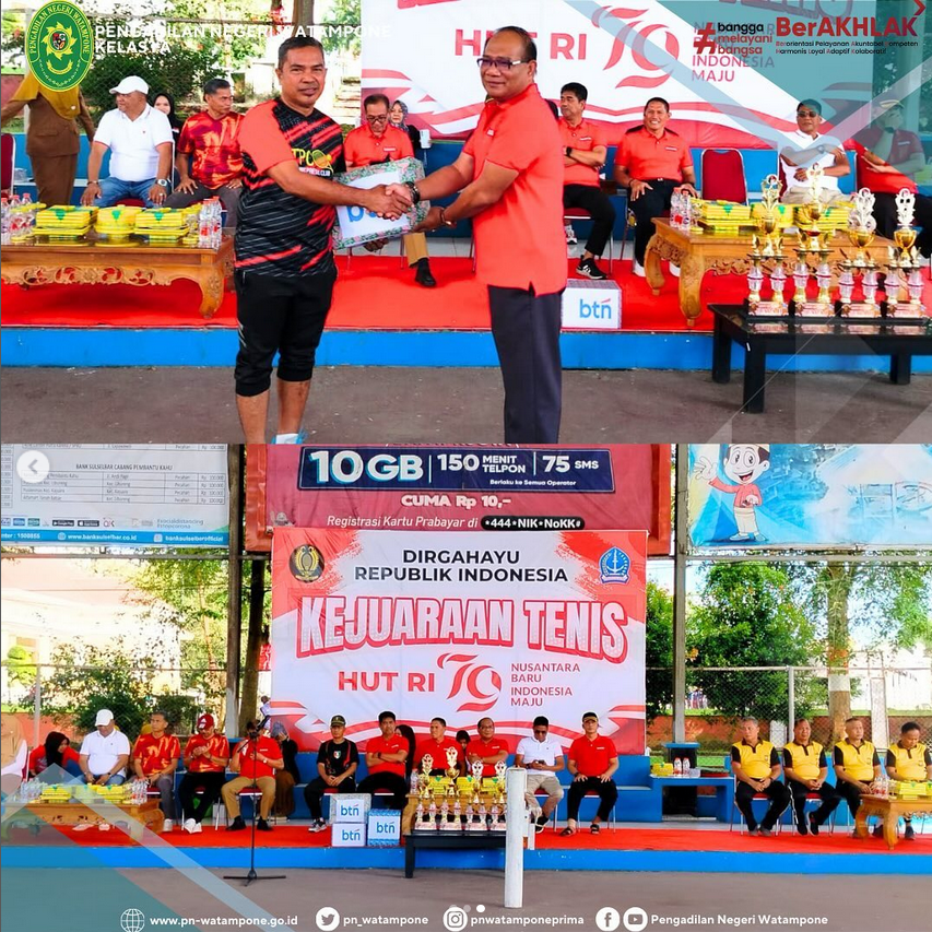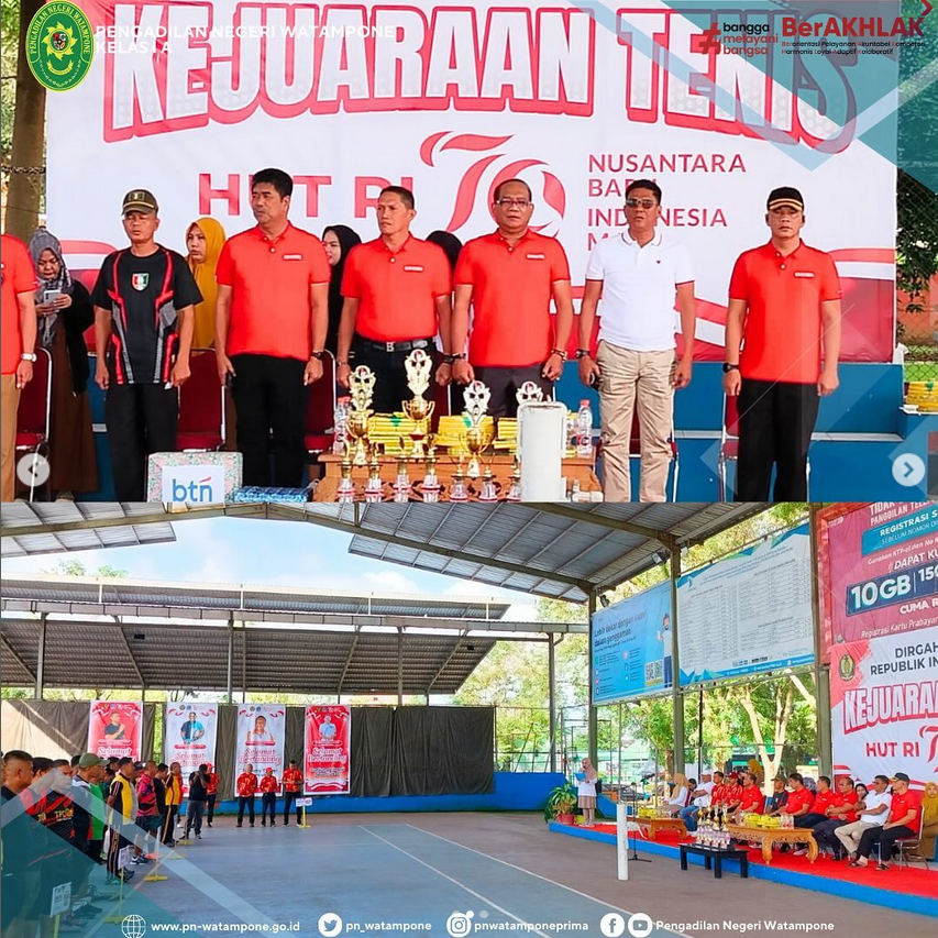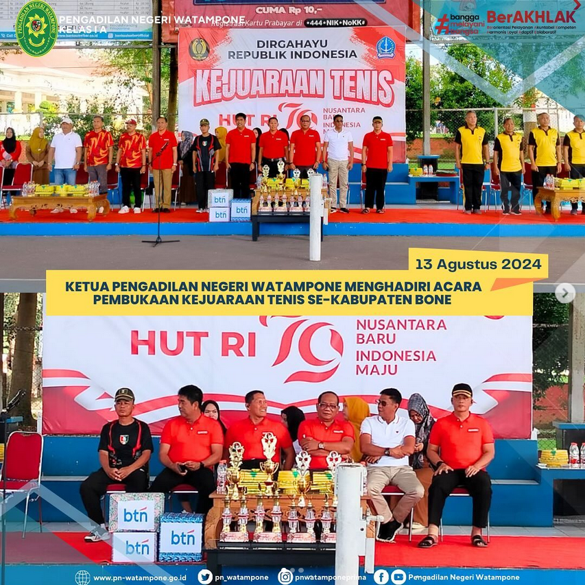 Rabu, 13 Agustus 2024, bertempat di Lapangan Tenis Merdeka Bone, Ketua Pengadilan Negeri Watampone (Bapak I Wayan Sukradana, S.H., M.H.) menghadiri acara pembukaan kejuaraan tenis beregu putra antar instansi/klub se-Kabupaten Bone dalam rangka memperingati HUT Kemerdekaan RI ke-79.