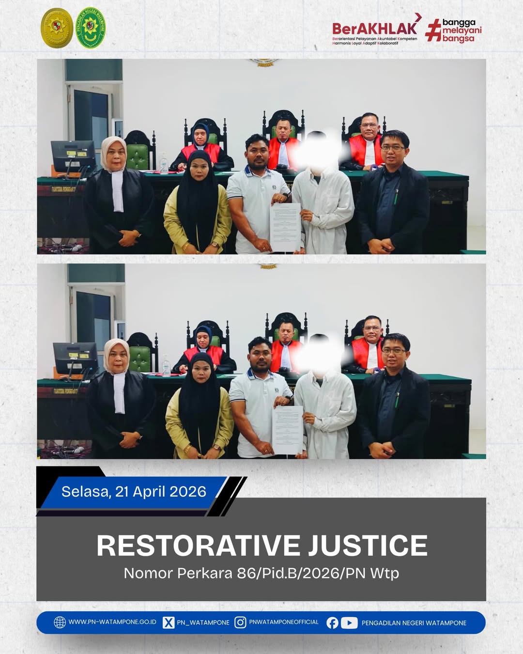 Sebagai bentuk penerapan keadilan yang humanis, Pengadilan Negeri Watampone melaksanakan Restorative Justice dalam perkara Nomor 86/Pid.B/ 2026/PN Wtp.Pendekatan ini bertujuan untuk memulihkan hubungan antara para pihak serta menciptakan penyelesaian yang adil, humanis, dan berorientasi pada pemulihan A