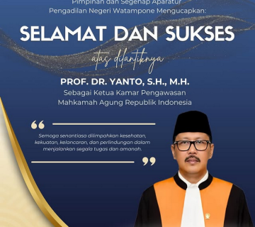 Keluarga Besar Pengadilan Negeri Watampone mengucapkan selamat dan sukses atas dilantiknya Prof. Dr. Yanto, S.H., M.H. sebagai Ketua Kamar Pengawasan Mahkamah Agung Republik Indonesia.