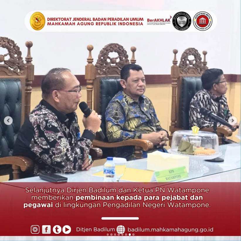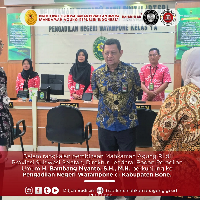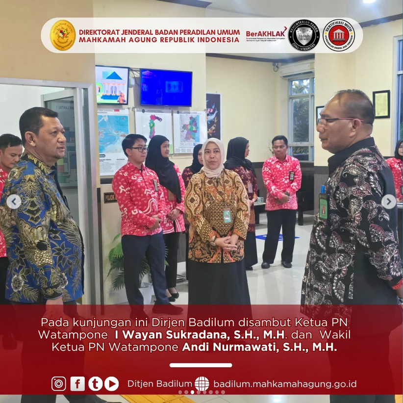 Dalam rangkaian pembinaan Mahkamah Agung RI di Provinsi Sulawesi Selatan, Direktur Jenderal Badan Peradilan Umum H. Bambang Myanto, S.H., M.H. berkunjung ke Pengadilan Negeri Watampone di Kabupaten Bone. Pada kunjungan ini Dirjen Badilum disambut Ketua PN Watampone I Wayan Sukradana, S.H., M.H. dan Wakil Ketua PN Watampone Andi Nurmawati, , S.H., M.H.