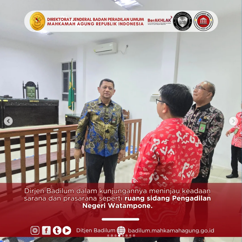 Dirjen Badilum dalam kunjungannya meninjau keadaan sarana dan prasarana seperti ruang sidang Pengadilan Negeri Watampone. Dirjen Badilum juga meninjau kualitas pelayanan dan berbincang dengan petugas Pelayanan Terpadu Satu Pintu (PTSP) di Pengadilan Negeri Watampone. Dirjen Badilum juga berkunjung ke ruang kerja dan melihat aktivitas para pegawai Pengadilan Negeri Watampone.
