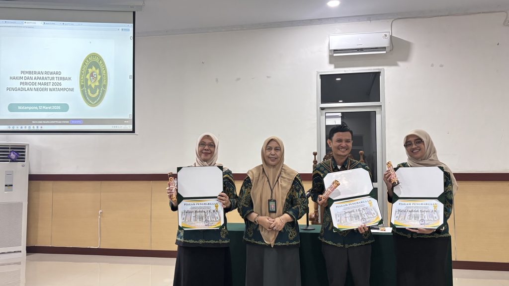 Pada kegiatan ini, Ketua Pengadilan Negeri Watampone turut memberikan reward kepada hakim dan pegawai yang berhasil menunjukkan kinerja terbaik sebagai bentuk apresiasi atas dedikasi, integritas, serta komitmen dalam melaksanakan tugas dan tanggung jawab. Pemberian penghargaan ini diharapkan dapat menjadi motivasi bagi seluruh aparatur untuk terus meningkatkan profesionalisme, disiplin, serta kualitas pelayanan kepada masyarakat.
