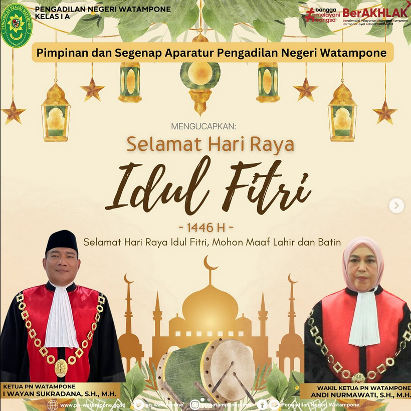 Home Pengumuman Segenap keluarga besar Pengadilan Negeri Watampone mengucapkan Selamat Hari Raya Idulfitri 1446 H. Mohon maaf lahir dan batin.