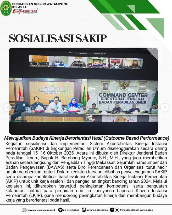 Kegiatan sosialisasi dan implementasi Sistem Akuntabilitas Kinerja Instansi Pemerintah (SAKIP) di lingkungan Peradilan Umum diselenggarakan secara daring pada tanggal 15–16 Oktober 2025. Acara ini dibuka oleh Direktur Jenderal Badan Peradilan Umum, Bapak H. Bambang Myanto, S.H., M.H., yang juga memberikan arahan secara langsung dari Pengadilan Tinggi Makassar. Sejumlah narasumber dari Badan Pengawasan (BAWAS) serta Biro Perencanaan dan Organisasi turut hadir untuk memberikan materi. Dalam kegiatan tersebut dibahas penyelenggaraan SAKIP serta disampaikan ikhtisar hasil evaluasi Akuntabilitas Kinerja Instansi Pemerintah (AKIP) untuk unit kerja eselon I dan pengadilan tingkat banding tahun 2024. Melalui kegiatan ini, diharapkan terwujud peningkatan kompetensi serta penguatan kolaborasi antara para pimpinan dan tim penyusun Laporan Kinerja Instansi Pemerintah (LKjIP), guna mendorong peningkatan kinerja dan membangun budaya kerja yang berorientasi pada hasil.